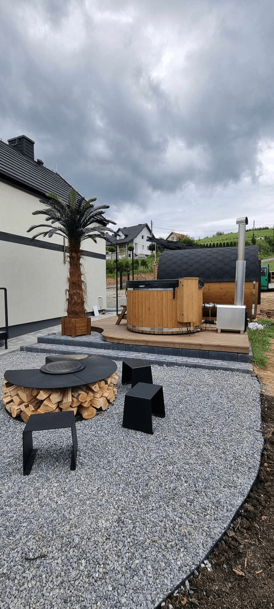 ✔ Prywatna strefa SPA – zewnętrzna balia, sauna i miejsce na ognisko